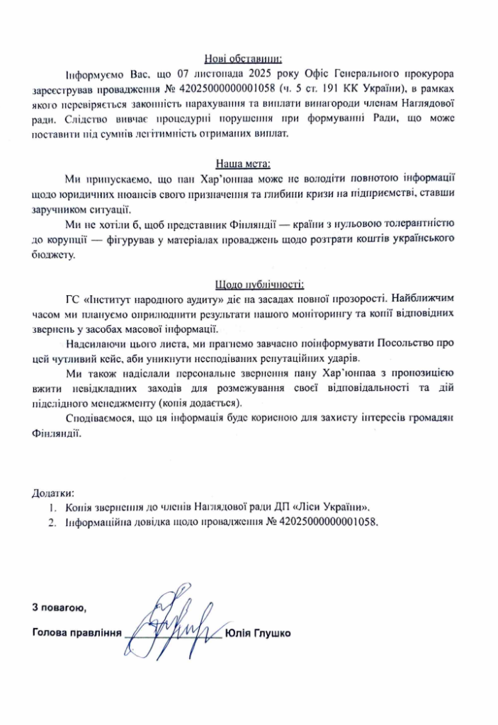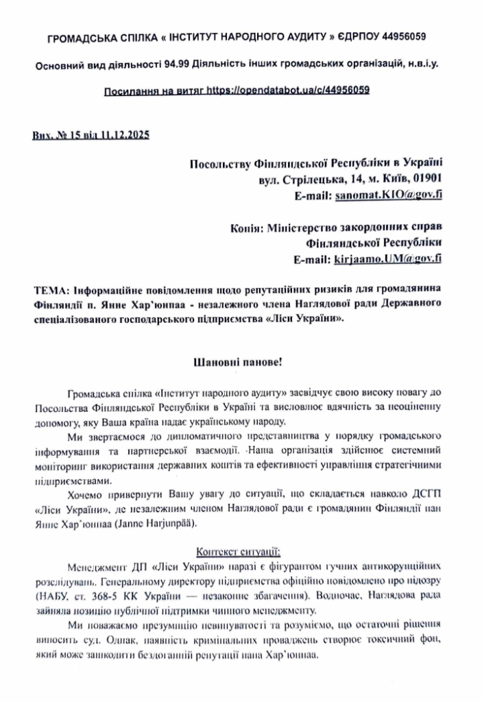 Саме на цьому тлі ГС «Інститут народного аудиту» підготувала окремі інформаційні листи до посольств Фінляндії, Латвії та Канади в Україні, а також до зовнішньополітичних відомств цих країн. У листі до Посольства Фінляндії громадські діячі попереджають про можливі репутаційні ризики для Янне Хар’юнпаа — незалежного члена Наглядової ради та громадянина Фінляндії. Наголошується, що кримінальне провадження № 42025000000001058 стосується законності нарахування і виплат винагороди всім членам Наглядової ради, а отже, може поставити під сумнів легітимність отриманих ним коштів. Автори припускають, що Хар’юнпаа може не володіти повнотою інформації про юридичні деталі свого призначення та глибину кризи на підприємстві, і заявляють, що не хотіли б бачити громадянина країни з «нульовою толерантністю до корупції» фігурантом справ про розтрату українських бюджетних коштів.