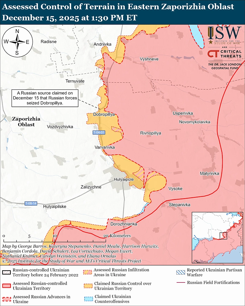 Оценка российской инфильтрации: представитель украинской бригады, действующей в направлении Гуляйполе, опроверг заявление Министерства обороны России о захвате Песчаное (к северу от Гуляйполя) 15 декабря и сообщил, что российские войска смогли лишь проникнуть в поселение. [74]
