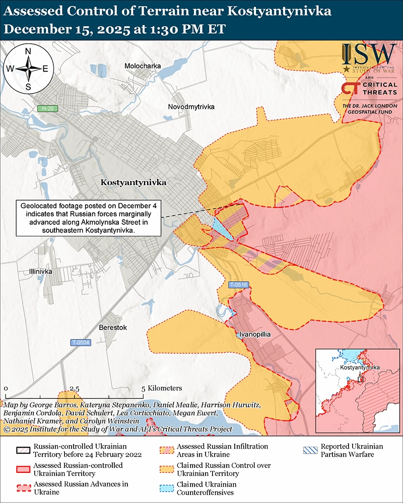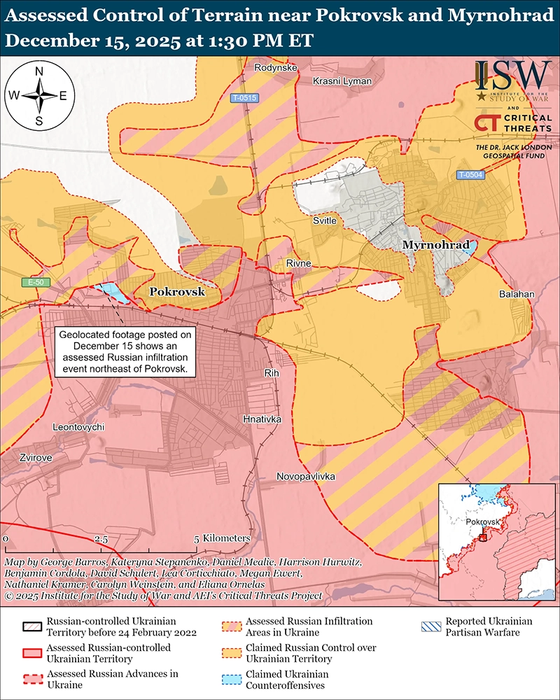 Оценка российского проникновения: геолокационные кадры, опубликованные 15 декабря, показывают российские войска, действовавшие к северу от Покровска во время миссии, которую ISW оценивает как российскую инфильтрационную миссию, не изменившую контроль над местностью или передовой границей зоны боевых действий (FEBA). [65]