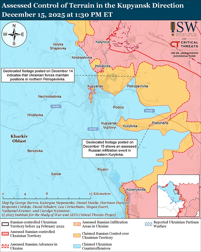 Уточнение территории по российскому контролю: геолокационные кадры, опубликованные 14 декабря, свидетельствуют о том, что украинские войска удерживают позиции или недавно продвигаются в западной части Волчанских Хуторов — районе, где российские источники ранее утверждали, что российские войска сохраняют присутствие. [39]