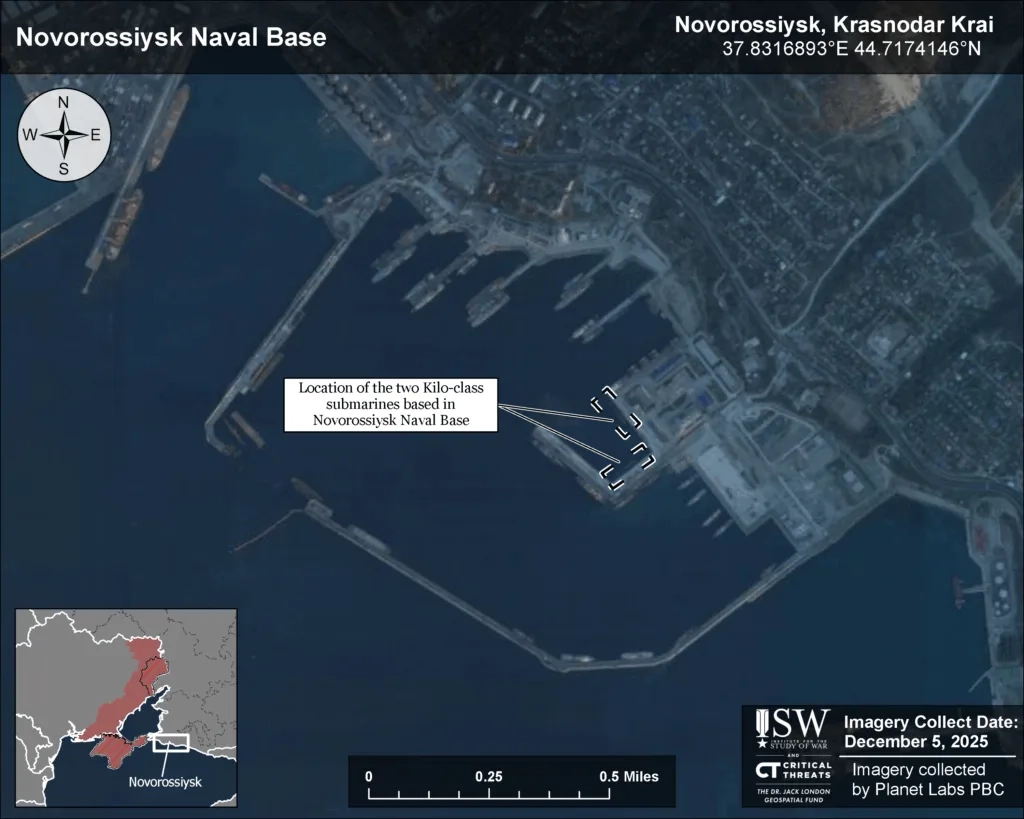В ночь с 14 на 15 декабря украинские силы впервые в истории военно-морского флота нанесли удар беспилотным подводным аппаратом (БПА) по российской подводной лодке. 15 декабря Служба безопасности Украины (СБУ) опубликовала видеозапись, позже геолоцированную, на которой видно, как украинские БПА «Sub Sea Baby» наносят удар по российской подводной лодке проекта 636 «Варшавянка» (класса НАТО «Кило»), пришвартованной на Новороссийской военно-морской базе в Краснодарском крае, вызывая взрывы и серьезные повреждения подводной лодки.[10] СБУ отметила, что подводная лодка была оснащена четырьмя пусковыми установками крылатых ракет «Калибр», которые Россия использовала для удара по Украине, и что повреждения, возможно, вынудили российские силы прекратить эксплуатацию подводной лодки. Спутниковые снимки Planet Labs, сделанные 5 декабря, показывают, что по состоянию на 5 декабря на Новороссийской военно-морской базе находились две подводные лодки класса «Кило», а снимки с более низким разрешением, сделанные 11 декабря, указывают на то, что по состоянию на 11 декабря на базе находилась как минимум одна подводная лодка класса «Кило». Данные системы NASA FIRMS (Национальное управление по аэронавтике и исследованию космического пространства), опубликованные 15 декабря, указывают на наличие пожаров вблизи Новороссийской военно-морской базы.[11] Ранее российские войска размещали подводные лодки класса «Кило» в оккупированном Крыму и порту Севастополя, но начали их вывод из западной части Черного моря и переброску в Новороссийский порт в октябре 2023 года в связи с успешной кампанией украинских ударов по объектам Черноморского флота России.[12] Россия использует подводные лодки класса «Кило» для нанесения ударов крылатыми ракетами «Калибр» по Украине, в первую очередь по Одесской области, и украинский удар, вероятно, был направлен на снижение способности России поражать Одесскую область ракетами «Калибр». Удар Украины по подводной лодке класса «Кило» в Новороссийске демонстрирует, что украинские силы продолжают модернизировать и оптимизировать свои беспилотные возможности, благодаря чему Украина может наносить удары по российским военным целям на дальности, которую российские силы ранее считали безопасной.