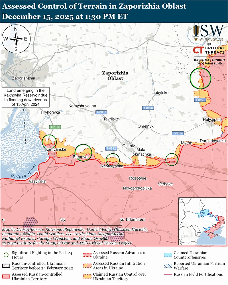 Зеленский заявил 15 декабря, что переговоры по территориальным вопросам продолжаются, а два американских чиновника, цитируемых NYT, сообщили, что Зеленскому и президенту России Владимиру Путину, вероятно, придется самим обсудить и принять решение по вопросу территориальных соглашений. [5] Путин последовательно отказывался встречаться с Зеленским, в том числе в преддверии полномасштабного вторжения и в нескольких последующих этапах мирных переговоров. [6] Ранее Россия пыталась добиться неприемлемых территориальных уступок от Украины, включая Крепостной пояс — укреплённую оборонительную линию в Донецкой области, которая служит основой обороны Украины с 2014 года. [7] Передача самой ценной линии обороны Украиной в руки Кремля предоставит России более выгодные позиции для возобновления агрессии против юго-западной и центральной Украины в будущем. [8] ISW продолжает оценивать, что Россия будет использовать политические и военные средства для достижения заявленной цели — захвата всей Украины, и поэтому вряд ли Россия примет мирное соглашение или гарантии безопасности, которые не предоставляют полный контроль России над Украиной в промежуточной и долгосрочной перспективе. [9]