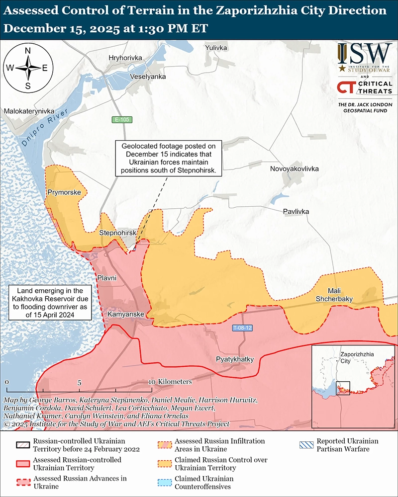 Оценка продвижения украинцев: геолокационные кадры, опубликованные 15 декабря, свидетельствуют о продвижении украинских войск к югу от Степногорска (к западу от Орехова). [83]