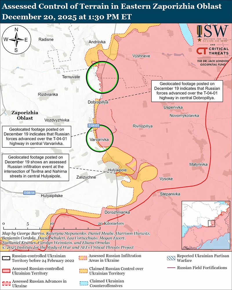 Оценка продвижения России: геолокационные кадры, опубликованные 19 декабря, свидетельствуют о том, что российские войска недавно продвинулись в центральной части Доброполья и Варваровки (оба к северу от Гуляйполя) и к востоку от обоих поселений. [85]