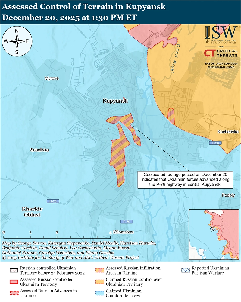 Оценка продвижение Украины: геолокационные кадры, опубликованные 20 декабря, свидетельствуют о том, что украинские войска недавно продвинулись вдоль шоссе-79 Купянск-Чугуев в центре Купянска. [38]