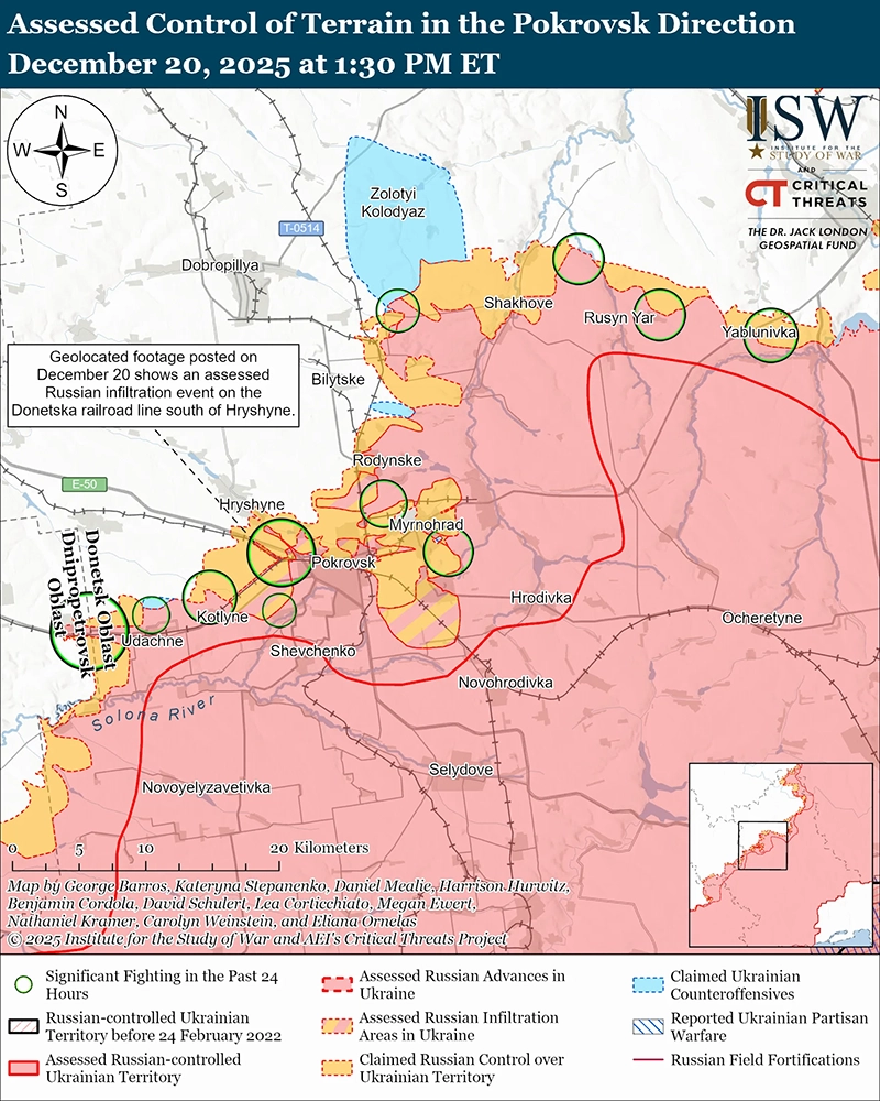 Оценены российские проникновения: геолокационные кадры, опубликованные 20 декабря, показывают, как двое российских военнослужащих поднимают российский флаг в юго-западном Светлое (северо-восточнее Покровска). [67] Дополнительные геолокационные кадры, опубликованные 20 декабря, показывают, как украинские войска наносят удары по русским военнослужащим вдоль Донецкой железной дороги к югу от Гришино (северо-западнее Покровска). [68] ISW оценивает, что это были российские миссии по проникновению и не изменяли контроль над местностью или передовой границей зоны боевых действий (FEBA) на тот момент.