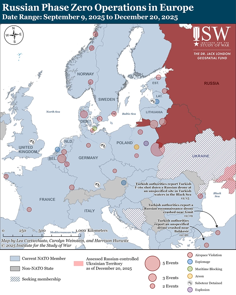 С 15 декабря три беспилотника — по меньшей мере два из которых, как сообщается, являются российскими моделями — вошли в воздушное пространство Турции или упали на ее территории. Министерство национальной обороны Турции сообщило 15 декабря, что турецкие и натовские силы сбили беспилотник, приближавшийся к турецкому воздушному пространству со стороны Черного моря.[17] Турецкие власти не уточнили тип или происхождение беспилотника. Министерство внутренних дел Турции сообщило 19 декабря, что турецкие власти обнаружили сбитый российский разведывательный беспилотник «Орлан-10» недалеко от Измита на северо-западе Турции.[18] 20 декабря турецкие СМИ сообщили, что третий беспилотник упал в провинции Балыкесир на северо-западе Турции, возможно, ранее, и что на беспилотнике не было никаких опознавательных знаков.[19] Российский военный блогер утверждал, что третий беспилотник был российским разведывательным беспилотником «Мерлин-ВР».[20] На момент написания этой статьи турецкие власти напрямую не связывали эти инциденты с Россией. ISW продолжает оценивать, что Россия усиливает свои тайные и открытые атаки против Европы и что Россия вступила в «нулевую фазу» — фазу формирования информационных и психологических условий — чтобы подготовиться к возможной войне НАТО и России в будущем. [21]