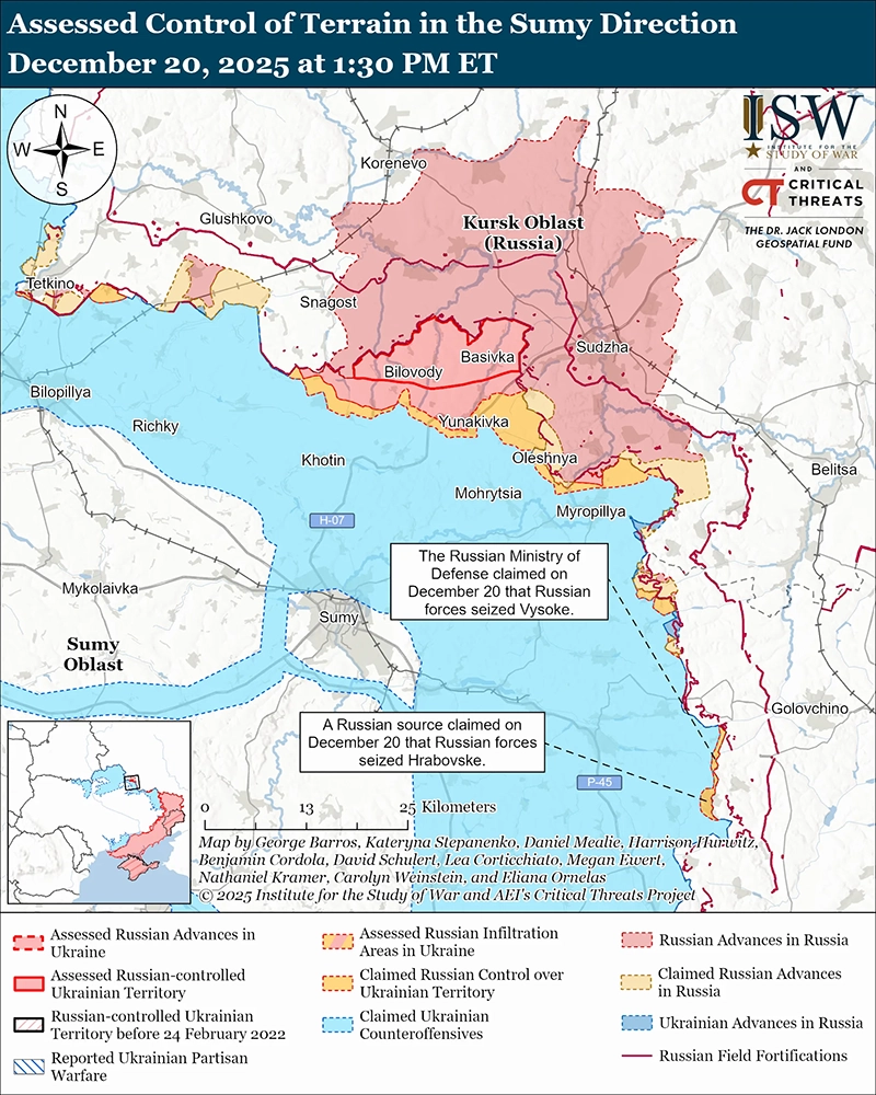 Неподтверждённые заявления: российские источники, включая Министерство обороны России, заявили 20 декабря, что российские войска захватили Высокое (к юго-востоку от города Сумы вдоль международной границы). [24] Российские военные блогеры приписывают захват поселения подразделениям 34-й российской мотострелковой бригады (49-я общевойсковая армия [ОA], Южный военный округ [ЮВО]). [25] Один российский военный блогер утверждал, что российские войска также захватили Грабовское (сразу к югу от Высокого). [26] ISW не фиксировал сообщений об активности в этом секторе границы с момента боев в конце лета 2025 года возле Демидовки, Белгородская область (северо-западнее Высокого). [27] Русский военблогер, связанный с Кремлём, отметил, что масштабы возобновленной российской активности в этом регионе пока неясны. [28]