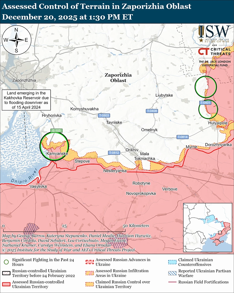 Уточнение территории под российским контролем: геолокационные кадры, опубликованные 19 декабря, показывают, как украинские военнослужащие захватывают российских военнослужащих и действуют в центральной и южной части Доброполья (к северу от Гуляйполя) и к югу от поселения — районах, где, по утверждениям российских источников, ранее сохраняли присутствие российские войска. [88]