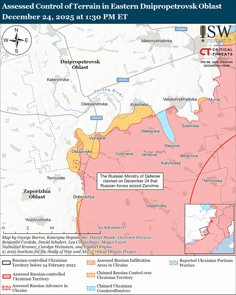 Кремлю придётся пойти на компромисс по требованиям, на которых он давно настаивал, включая многие, которые несовместимы не только с последним мирным планом из 20 пунктов, но и с первоначальным планом из 28 пунктов. Посол США в НАТО Мэтт Уитакер заявил 23 декабря на Fox News, что «мяч сейчас находится на [российском] поле», чтобы ответить на четыре документа, появившихся в ходе недавних американо-украинско-европейских переговоров. [6] Уитакер отметил, что высокие потери, которые российские войска несут в обмен на «очень малые» успехи на поле боя, не подталкивают Кремль к попыткам закончить войну. Кремль уже дал понять, что не заинтересован в принятии украинских или европейских контрпредложений к какому-либо мирному соглашению, при этом помощник президента России Юрий Ушаков 21 декабря (до публикации плана из 20 пунктов) заявил, что он «уверен», что предложения, сделанные украинскими и европейскими делегациями во время переговоров с американской делегацией в Майами, будут «довольно неконструктивными» и не «улучшат» тогда предложенное соглашение о урегулировании. [7] Кремль неоднократно выдвигал требования, несовместимые со многими предложениями плана из 20 пунктов, и показывал, что не заинтересован в решении, основанном на компромиссах, подобных тем, что воплощает последний документ. Президент России Владимир Путин ещё 19 декабря изложил свою приверженность требованиям, которые он изложил в своей речи в Министерстве иностранных дел России в июне 2024 года: полный вывод войск Украины из Луганской, Донецкой, Запорожской и Херсонской областей; отказ Украины от своих стремлений к членству в НАТО и приверженности нейтралитету; демилитаризация Украины (требование России ограничить украинскую армию так, чтобы Украина не могла защитить себя), денацификация Украины (российское требование заменить нынешнее украинское правительство пророссийским марионеточным правительством), международное признание аннексий Россией четырёх украинских областей и Крыма в международных соглашениях; и снятие всех западных санкций против России. [8] Требования Путина от июня 2024 года фактически повторяли его требования с начала полномасштабного вторжения в 2022 году. Кремлёвские чиновники также утверждали, что Россия и США достигли взаимопонимания на основе требований Путина июня 2024 года во время августовского саммита 2025 года на Аляски, но публично доступных соглашений на саммите не было выявлено. [9] Продолжающиеся ссылки Кремля на речь июня 2024 года и предполагаемые соглашения на Аляске демонстрируют отклонение Кремлем предложений из 28 и 20 пунктов по заморозке текущих линий в Запорожской и Херсонской областях или во всех четырёх областях.