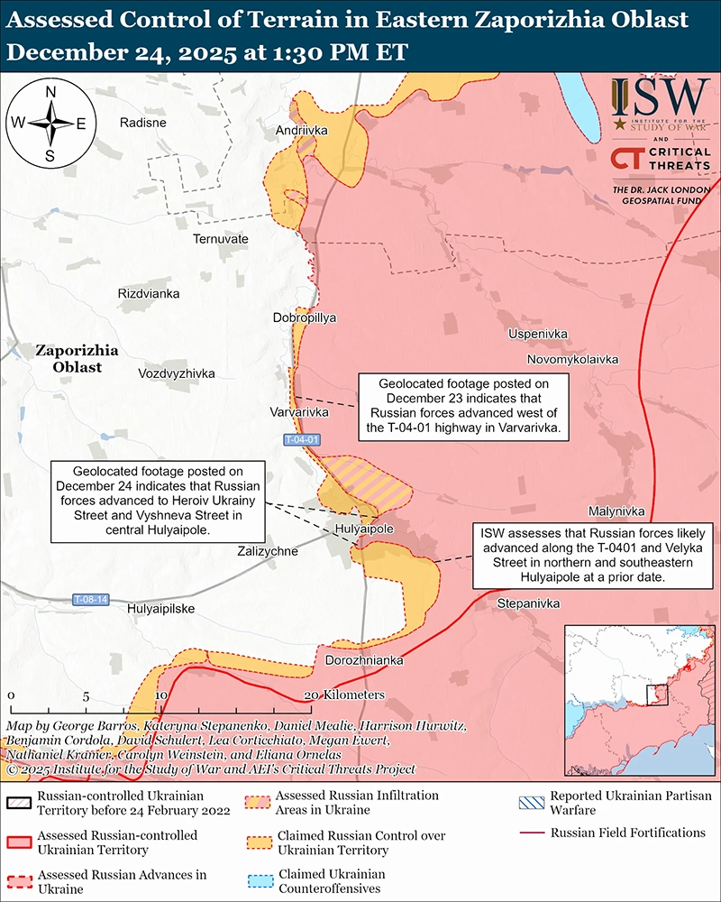 Оценка российского проникновения: российский военный блогер заявил 24 декабря, что российские войска продвинулись в северном Гуляйполе, что позволяет предположить, что российские войска, вероятно, вошли в северное Гуляйполе с севера во время недавней миссии по проникновению (FEBA), и оценка ISW не изменила контроль над местностью или передним краем боевых действий (FEBA). [103]