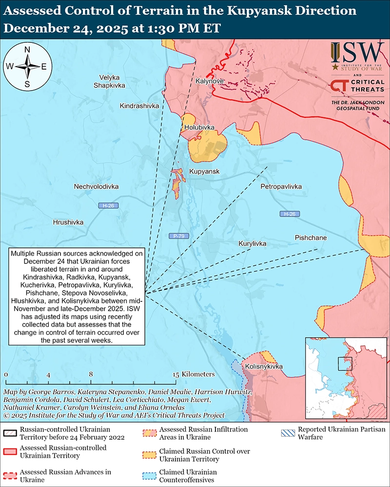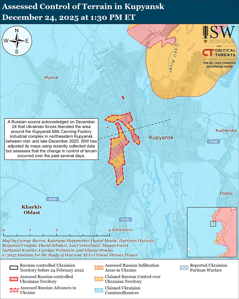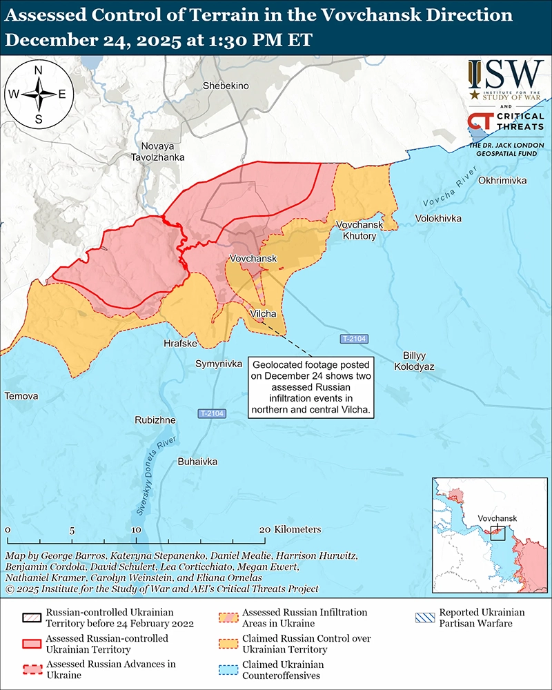 Оценены российские инфильтрации: геолокационные кадры, опубликованные 24 декабря, показывают, как украинские войска наносят удары по зданиям, оккупированным Россией, в северной и центральной части Вильчи (к северо-востоку от Харькова), после, по оценкам ISW, российских миссий по проникновению, не изменяющих контроль над местностью или передовой линией боевых действий (FEBA). [45]