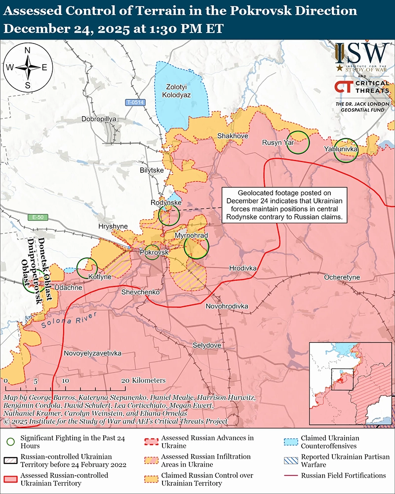 Пресс-секретарь украинской бригады, действующей в Мирнограде, сообщил 23 декабря, что украинские войска продолжают контролировать части Мирнограда, и опроверг российские заявления о том, что российские войска полностью окружили украинские войска внутри города. [88] Представитель добавил, что российские войска иногда имеют «от десяти до ста» военнослужащих, действующих в Мирнограде, и что количество российских войск, входящих в город, зависит от погодных условий. Представитель сообщил, что ротации украинских войск в Мирнограде требуют тщательного планирования и зависят от погоды и уровня активности России. Пресс-секретарь украинской бригады, действующей на Покровском направлении, сообщил 24 декабря, что хорошо обученные российские операторы дронов создают значительные трудности для украинских сил. [89]