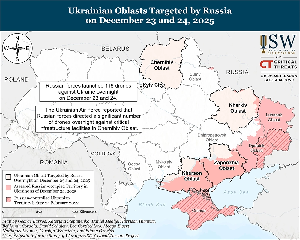 Российские войска продолжают наносить удары по энергетической инфраструктуре в Украине, особенно по критически важной инфраструктуре в Черниговской области в ночь с 23 на 24 декабря. Воздушные силы Украины сообщили, что российские войска запустили 116 ударных дронов типа Шахед, Гербера и других — из которых примерно 90 были дроны типа Шахед — со стороны Миллерово, Ростовская область; городов Курск и Орел; Шаталово, Смоленская область; Приморско-Ахтарск, Краснодарский край; и оккупированного Гвардейского, Крым. [28] Воздушные силы Украины сообщили, что украинские войска сбили 60 дронов на севере, юге и востоке Украины. Воздушные силы Украины сообщили, что российские силы направили значительное количество дронов против критически важных объектов инфраструктуры Черниговской области, а 48 дронов нанесли удары по 19 объектам по состоянию на 08:30 местного времени. Государственный энергетический оператор Украины «Укрэнерго» сообщил об отключениях электроэнергии в Сумской, Днепропетровской, Херсонской, Харьковской и Черниговской областях после ночных ударов. [29] Черниговские городские и областные власти сообщили, что российские войска нанесли удар по критически важной и энергетической инфраструктуре в Черниговском районе вечером 23 и 24 декабря, в результате чего десятки тысяч жителей Черниговской области остались без электричества. [30] Власти Чернигова также сообщили, что российские войска нанесли удар по жилому дому и как минимум по крайней мере двум другим объектам в городе, возможно, с помощью реактивного дрона Shahed. [31] Харьковские городские и областные власти сообщили, что российские войска нанесли удар по тепловой электростанции (ТЭС) в пригородах Харькова, возможно, с применением системы залпового огня Tornado (РСЗО), в результате чего погиб как минимум один человек и 13 получили ранения, а также нанеся ущерб близлежащему транспортному предприятию. [32] Мэр города Харькова Игорь Терехов заявил, что удар нарушил производство электроэнергии, теплоснабжение и транспорт в городе, а серьёзный ущерб ТЭС заставил город перейти на электроснабжение через «энергетические острова». [33] Глава Херсонской городской военной администрации Ярослав Шанько также сообщил, что российские войска нанесли удары по критически важной и жилой инфраструктуре города, убив как минимум одного человека и ранив другого. [34] Украинская компания по добыче нефти и природного газа Укрнафта сообщила, что российские войска запустили почти 100 ударных дронов по производственным объектам Укрнафты с 22 по 24 декабря, что нанесло ущерб оборудованию и вынудило Укрнафту временно приостановить часть производства. [35] Удары России с 23 по 24 декабря последовали за масштабными комбинированными ракетными и беспилотными ударами, которые в основном затронули энергетическую инфраструктуру западной Украины с 22 по 23 декабря. [36] Последовательные российские удары по энергетической инфраструктуре на западе и востоке Украины, вероятно, являются частью продолжающейся кампании России по разделению энергетической сети Украины пополам. [37]