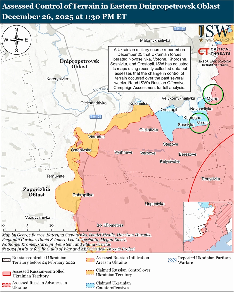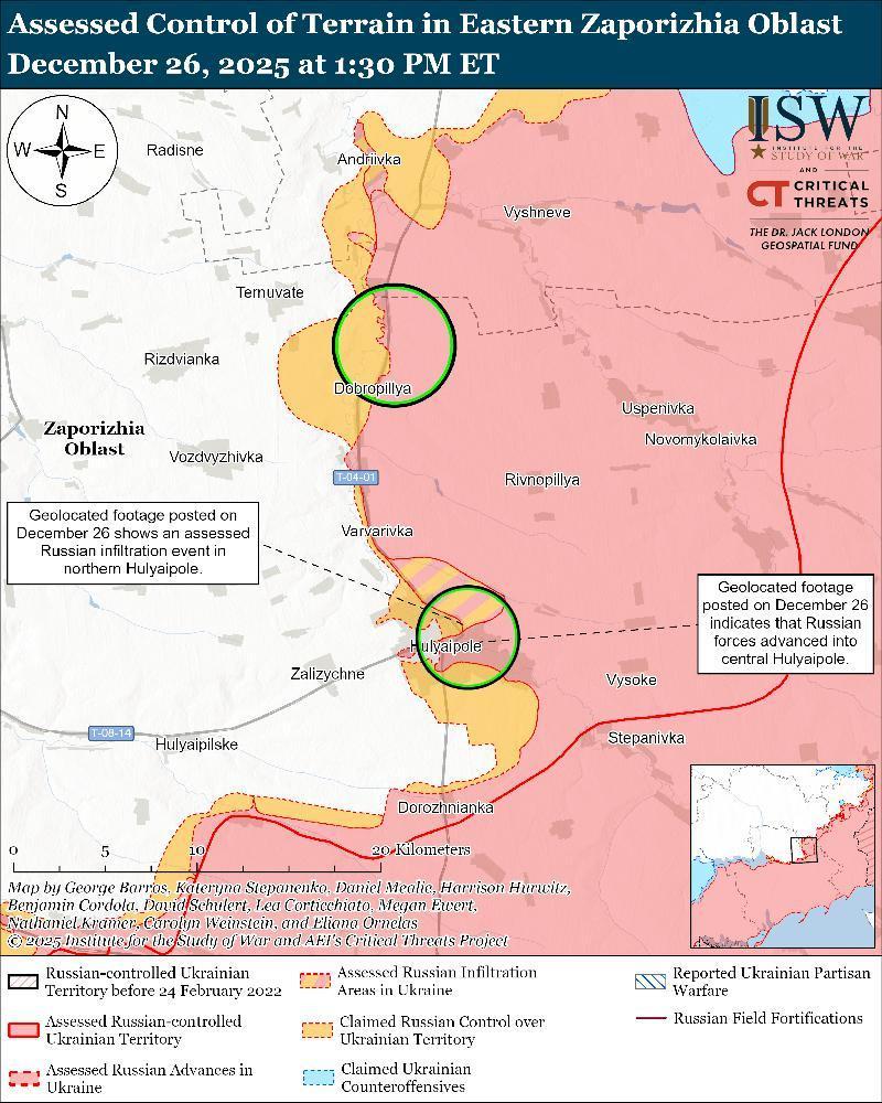 Геолокационные кадры, опубликованные 26 декабря, свидетельствуют о том, что российские войска недавно продвинулись в центре Гуляйполя. [52] Сообщается, что российские войска недавно захватили штаб украинского батальона в центре Гуляйполя. [53] Украинские сообщения предполагают, что российские войска воспользовались украинскими тактическими ошибками, чтобы продвинуться в пределах Гуляйполя, подобно тому, как российские войска воспользовались тактическими украинскими ошибками во время ротации возле Очеретино на авдеевском направлении в апреле 2025 года, чтобы узко прорвать украинскую оборону.[54] Недавние российские продвижения в Гуляйполе, вероятно, также связаны с численном превосходством России в этом районе. Российские силы сосредоточили две российские общевойсковые армии (ОА) — 35-ю и 5-ю ОА (обе из Восточного военного округа [ВВО]) — и 11-ю армию ВВС и ПВО (Российские воздушно-космические силы [ВКС] и ВВО) в районе Гуляйполя. [55] Однако приоритетное распределение сил в усилиях по захвату Гуляйполя, вероятно, оставило другие близлежащие районы, такие как район Орестополь-Новоселовка-Хорошее-Вороное-Сосновка, примерно в 30 километрах к северу от Гуляйполя, уязвимыми для украинских контратак. Российские войска показали, что могут продвигаться — хотя всё ещё медленно и с высокими затратами — когда концентрируют большое количество личного состава и техники на определённом секторе. ISW оценил, что российские силы добились тактического прорыва к северо-востоку и востоку от Гуляйполя в середине ноября 2025 года, частично за счёт концентрации и накопления в течение нескольких месяцев группировки, сопоставимой по численности с той, что действовала в направлении Покровск-Доброполье против относительно меньших украинских сил. [56] Украинский военный наблюдатель Константин Машовец отметил 13 декабря, что российские войска всё чаще испытывают трудности с проведением одновременно наступательных операций в зоне ответственности 5-й ОA к востоку и северо-востоку от Гуляйполя, а также в зоне ответственности 36-й ОA (ВВО) в направлении Александровки. [57] Машовец оценил, что Восточная группировка войск России потребует перегруппировки или получения войск и материальных подкреплений с других оперативных направлений для продолжения наступательных операций в направлении Гуляйполе. Президент России Владимир Путин и высокопоставленные российские военные продолжают утверждать, что российские войска продолжают продвигаться вдоль всей линии фронта, но неспособность России защитить фланги, сосредоточившись на Гуляйполе, противоречит реальной способности России это делать. [58] Российские усилия начать битву за Крепостной пояс — главную укреплённую линию обороны Украины в Донецкой области с 2014 года — вероятно, ещё больше истощат российские ресурсы, и России, вероятно, придётся сосредоточить ещё больше сил и отдать приоритет другим секторам, чтобы попытаться захватить остальную часть Донецкой области. [59]