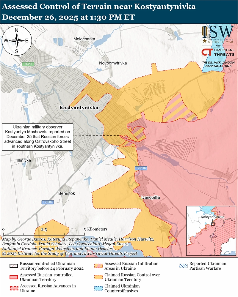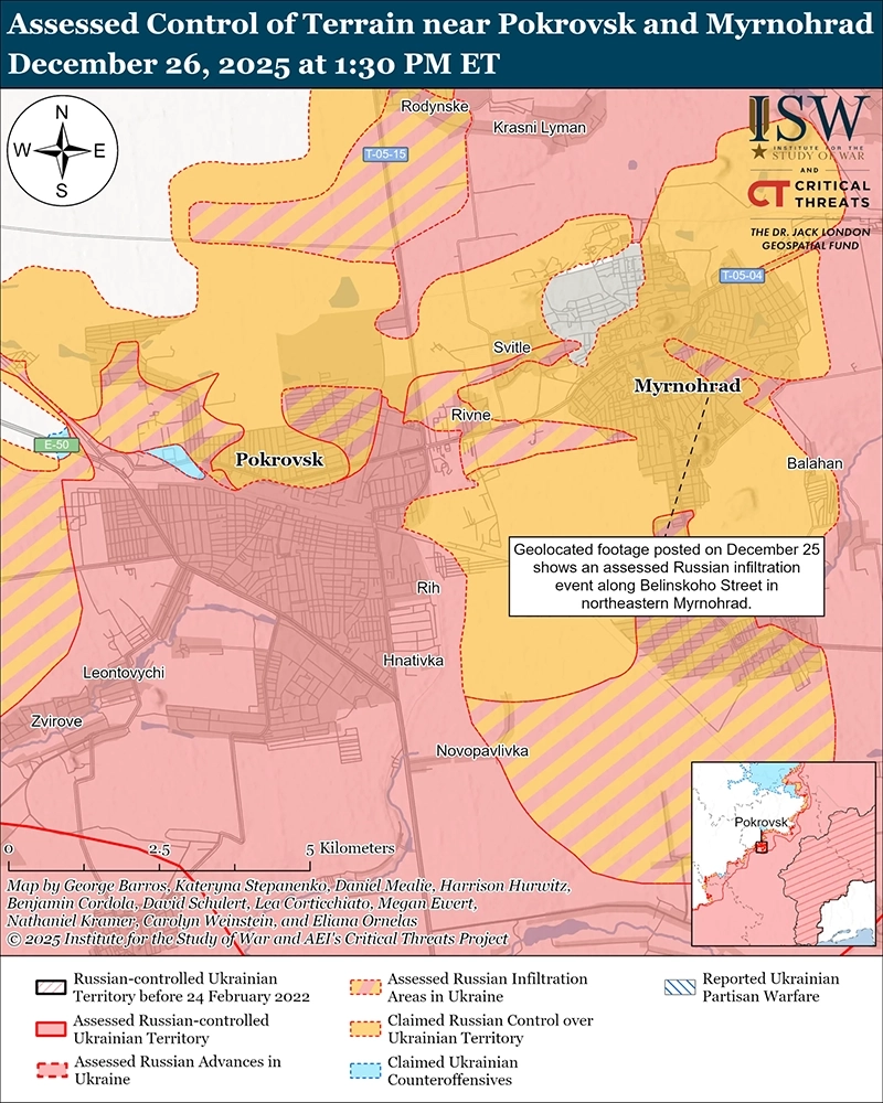 Оценка российской инфильтрации: геолокационные кадры, опубликованные 25 декабря, показывают, как украинские войска наносят удары по зданиям, оккупированным Россией, на северо-востоке Покровска (к востоку от Покровска) и по русским войскам к северо-западу от Покровска, в рамках которые, по оценке ISW, были российской миссии по проникновению и не изменяя контроль над местностью или FEBA. [150]