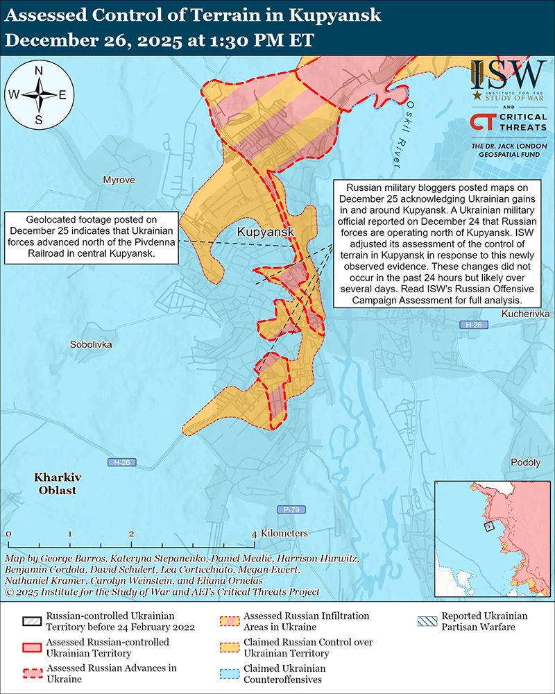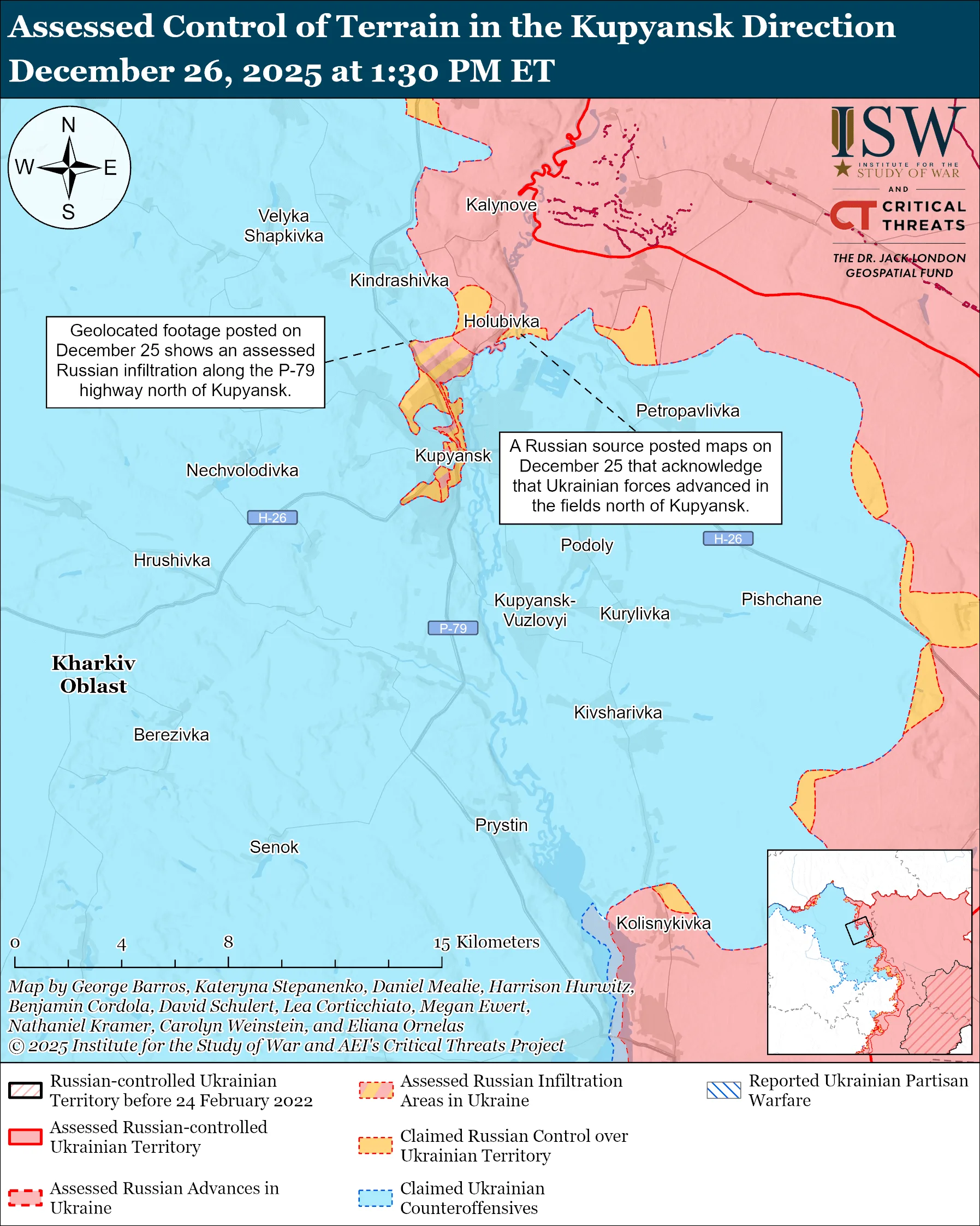 Российские военные блогеры продолжали обвинять ухудшение ситуации в Купянске в широком распространении российской практики отправки ложных сообщений по цепочке командования.[33] Российский военный блогер оценил, что российскому военному командованию придётся перебросить дополнительные силы в сектор Купянск и скорректировать свои планы с учётом реальной ситуации — а не «сообщаемой» ситуации — для стабилизации района. [34] Однако военный блогер признал, что быстрое изменение ситуации в пользу России маловероятно. Другой российский военблогер заявил, что проблемы России с ложными сообщениями о Купянске накапливаются с лета 2025 года, когда Министерство обороны России заявило, что российские войска полуокружили Купянск и захватили ряд поселений на западе. [35] Однако военблогер заявил, что российские войска так и не установили прочного и устойчивого контроля над Радковкой, Мирово и Соболевкой (все северо-западнее и западнее Купянска), и что украинские войска смогли использовать эти слабые места. Военблогер добавил, что российские войска контролировали лишь чуть более половины Купянска, когда Министерство обороны России объявило о захвате города в конце ноября 2025 года. Российский военблогер, активно занимающийся краудфандингом, распространил кадры, на которых российский солдат комментирует Купянск, заявляя, что нельзя сдать то, что не захвачено полностью.[36]