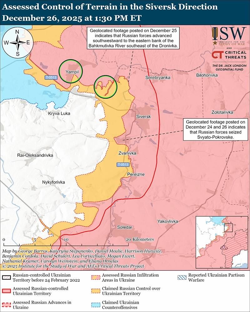 Оценка продвижения России: геолокационные кадры, опубликованные 26 декабря, свидетельствуют о том, что российские войска недавно захватили и продвинулись к северу от Свято-Покровского (юго-западнее Северска). [116] Геолокационные кадры, опубликованные 21 и 25 декабря, свидетельствуют о том, что российские войска недавно продвинулись к юго-востоку от Дроновки (северо-западнее Северска) и на севере Свято-Покровского (юго-западнее Северска). [117] Российские источники, включая Министерство обороны России, утверждали 25 декабря, что российские войска захватили Свято-Покровское (к юго-западу от Северска). [118]