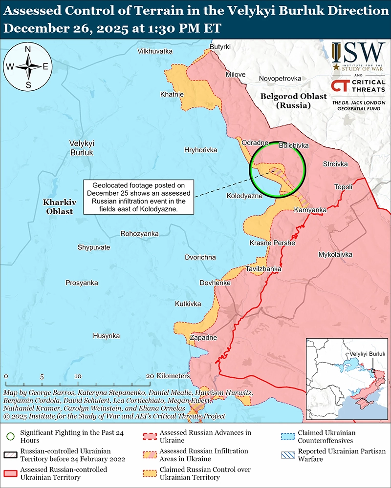 Оценка российского проникновения: геолокационные кадры, опубликованные 25 декабря, показывают российские войска, действующие к югу от Двуречанского (к юго-востоку от Великого Бурлука) после того, что, по оценке ISW, было российской миссией по проникновению России, которая не изменила контроль над местностью или передовой границей зоны боевых действий (FEBA). [93]