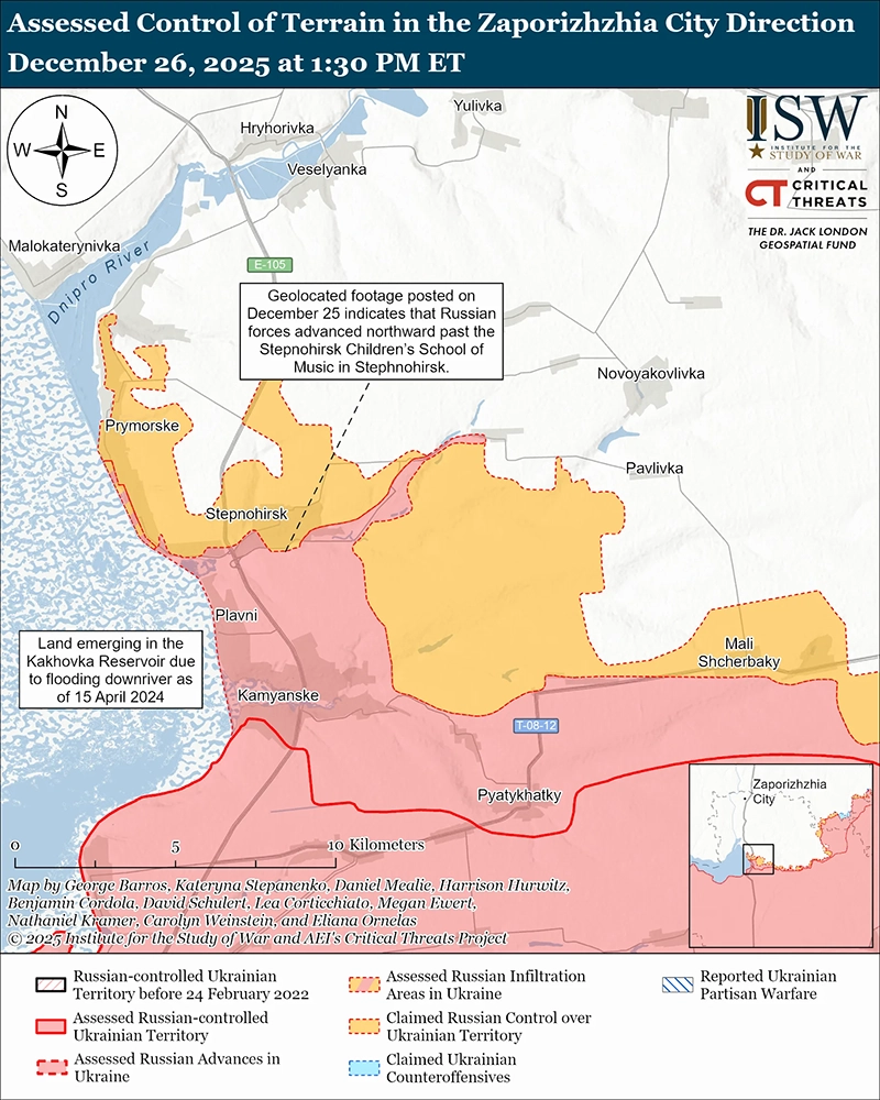 Российские войска атаковали к северо-западу от Орехова в сторону Павловки и Лукьяновского и западнее Орехова возле Приморского и Степногорска 24, 25 и 26 декабря. [186]