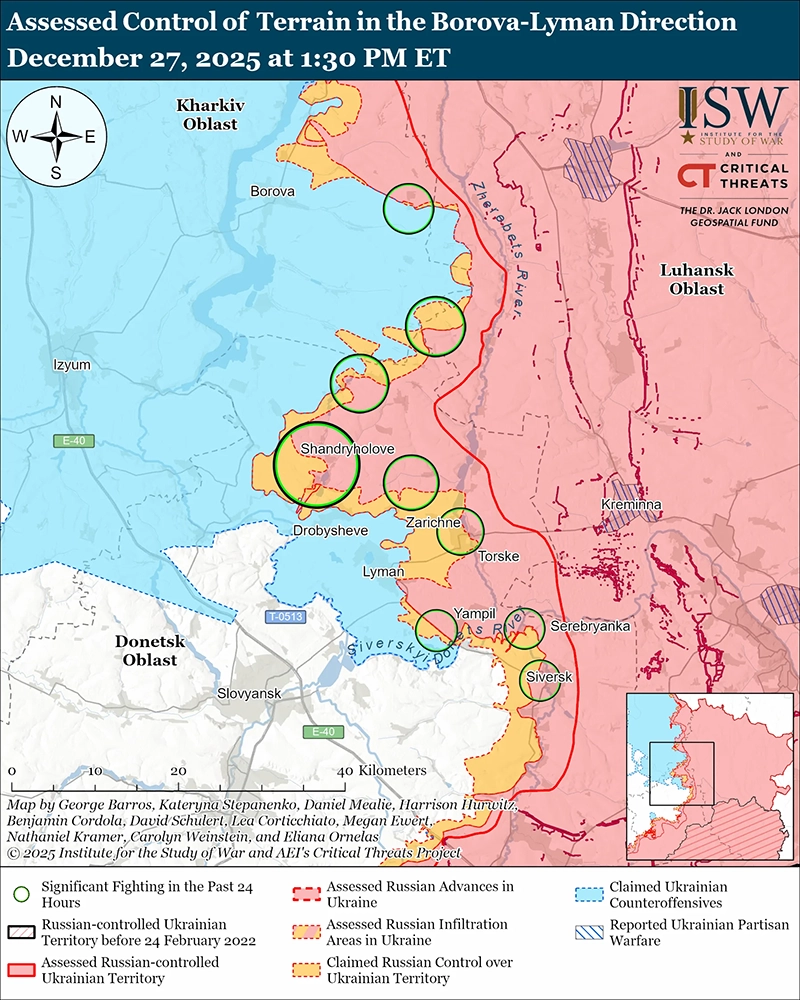 Украинская бригада, действующая на направлении Северска, сообщила 27 декабря, что российские войска применяют тактику небольших групп для проникновения в Дроновку и захвата позиций вдоль ключевых наземных линий коммуникаций (НЛК) из Северска и Ямполя. [55] Российский военный блогер заявил, что российские операторы дронов продолжают воспрещать украинским силам в возможности безопасно перемещаться по НЛК между Славянском и Рай-Александровкой (юго-западнее Северска). [56]
