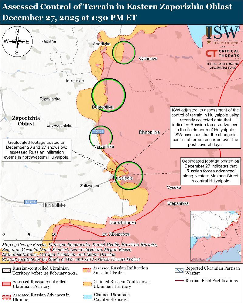 Оценка продвижения России: опубликованные 26 декабря видеозаписи с геолокацией указывают на то, что российские войска недавно незначительно продвинулись в центральной части Гуляйполя.[81] Имеющиеся видеодоказательства и отчеты украинских военных источников указывают на то, что российские войска также продвинулись к северу от Гуляйполя и что передовая граница российской зоны боевых действий (FEBA) находится южнее, на полях к северу от Гуляйполя, чем предполагалось ранее ISW.[82]