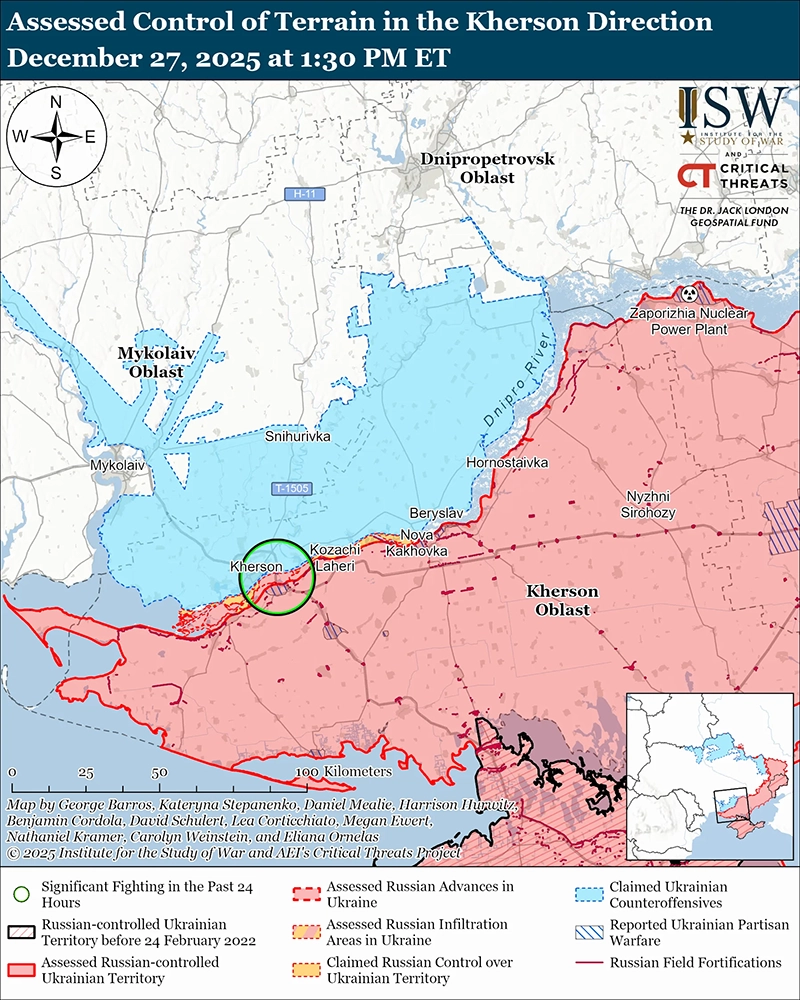 Российские войска продолжили наступательные операции на направлении Херсона 27 декабря, но не продвинулись.