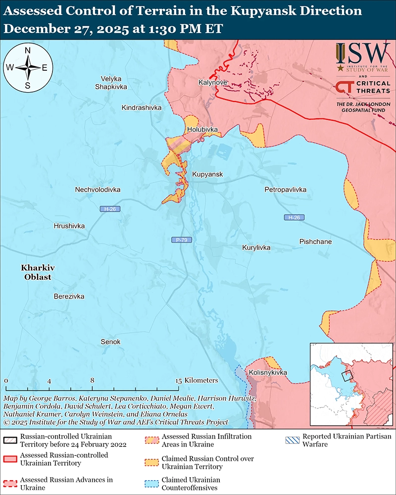 Представитель украинской бригады, действующей на направлении Купянска, сообщил 27 декабря, что российские войска значительно увеличили численность экипажей беспилотников в районе для реагирования на украинские контратаки после недавнего улучшения погоды. [45] Представитель сообщил, что российские войска недавно развернули элементы подразделения «Судный день» (связанного с добровольческой группой батальона Судоплатов) и используют больше волоконно-оптических и беспилотников «Молния». Однако представитель заявил, что количество российских атак сократилось, и российские войска накапливают силы в тылу на восточном (левом) берегу реки Оскол. Российский военный блогер и бывший инструктор Шторм-Z отметил, что другие российские источники всё чаще сообщают о том, что российские операторы дронов в направлении Купянска работают постоянно и без перерывов, и оценил, что это указывает на отсутствие достаточного количества операторов дронов в российских силах для реагирования на украинские контратаки, которые продолжаются «уже довольно давно». [46][47]