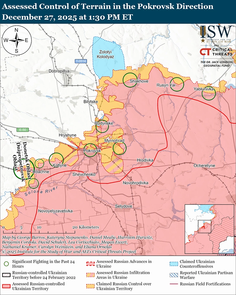 Российские войска атаковали внутри и вокруг самого Покровска; к северу от Покровска возле Белицкого и Родинского; северо-восточнее Покровска возле Красного (Червоного) Лимана; восточнее Покровска возле Мирнограда; юго-западнее Покровска возле Котлино, Удачного и Молодецкого; и к северо-западу от Покровска возле Гришино 26 и 27 декабря. [69] Российский военный блогер заявил, что украинские войска контратаковали возле Гришино. [70]