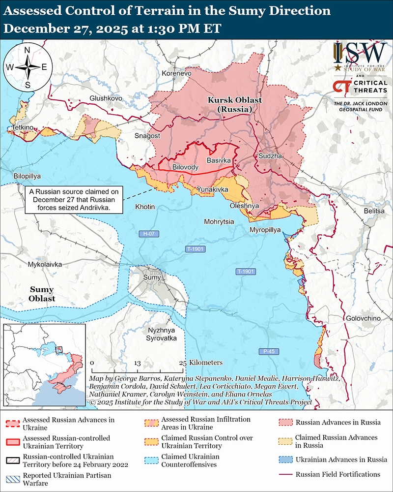 Российские войска атаковали в Сумской и Курской областях, включая севернее города Сумы возле Кондратьевки, Андреевки и Алексеевки, 26 и 27 декабря. [33] Российские военные блогеры утверждали, что украинские войска контратаковали возле Варачино (к северу от города Сумы). [34]
