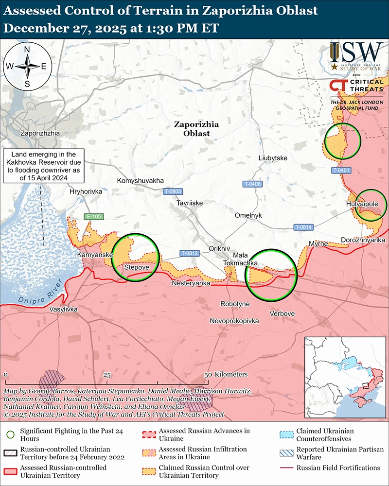Российские войска продолжили наступательные операции в западной части Запорожской области 27 декабря, но не продвинулись.