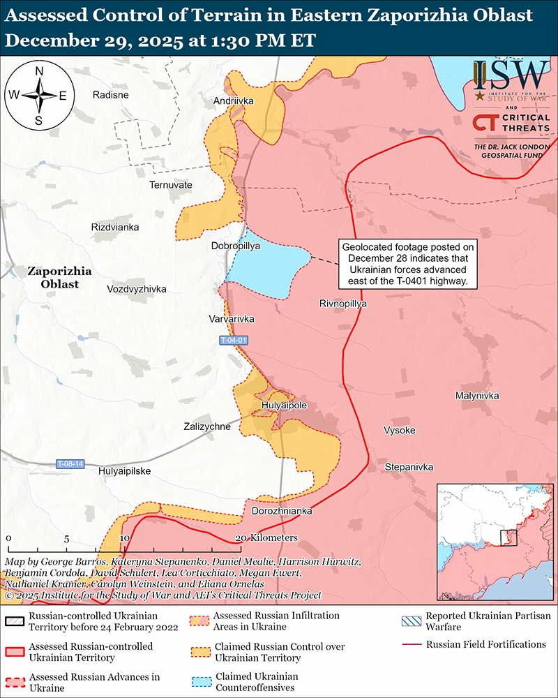 Оценка продвижения России: Геолокационные кадры, опубликованные 27 декабря, свидетельствуют о том, что российские войска недавно продвинулись в западном Степногорске (к западу от Орехова) и к северо-востоку от поселения. [100]