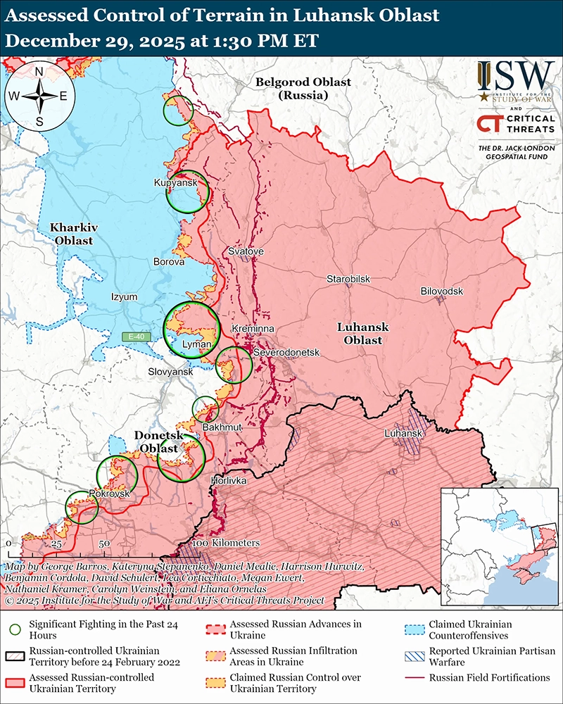 Президент России Владимир Путин и высокопоставленные российские военные командиры провели очередное совещание, чтобы усилить тактические детали и создать ложное впечатление, что передовые линии фронта по всей Украине находятся на грани краха. Путин встретился с руководством Генерального штаба России и группой командующих группировками войск 29 декабря — после серии показных, публичных встреч между Путиным и его командирами в последние недели, включая последнюю встречу 27 декабря. [16] Путин, начальник Генерального штаба России генерал армии Валерий Герасимов и группы командующих группировками войск сделали ряд преувеличенных заявлений об успехах России на поле боя, все они опираются на преувеличенные количественные данные, призванные скрыть относительно медленный темп наступления России. Герасимов заявил, что российские войска захватили более 700 квадратных километров и 32 поселения в Украине в декабре 2025 года, а также 6 640 квадратных километров и 334 поселения в 2025 году. ISW обнаружил свидетельства присутствия России (через штурмовые операции или миссии по проникновению) на площади 480 квадратных километров, а также о том, что российские войска захватили или полностью проникли в 23 поселения в декабре 2025 года. ISW также обнаружила свидетельства присутствия России на территории 4 952 квадратных километра и захватила или полностью проникла в 245 поселений за весь 2025 год. Командующий Северной группировкой войск России генерал-полковник Евгений Никифоров заявил, что российские войска захватили 940 квадратных километров в Харьковской и Сумской областях в 2025 году. ISW обнаружил доказательства оценки российского присутствия на площади 639 квадратных километров в Харьковской и Сумской областях в течение 2025 года. Никифоров, в частности, заявил, что российские войска продвинулись на расстояние 20 километров от города Сумы в 2025 году — что подразумевает признание того, что российские войска продвинулись менее чем на семь километров в этом районе, учитывая, что город Сумы расположен примерно в 27 километрах от северной международной границы Сумской области, где российские войска занимают самые глубокие позиции.