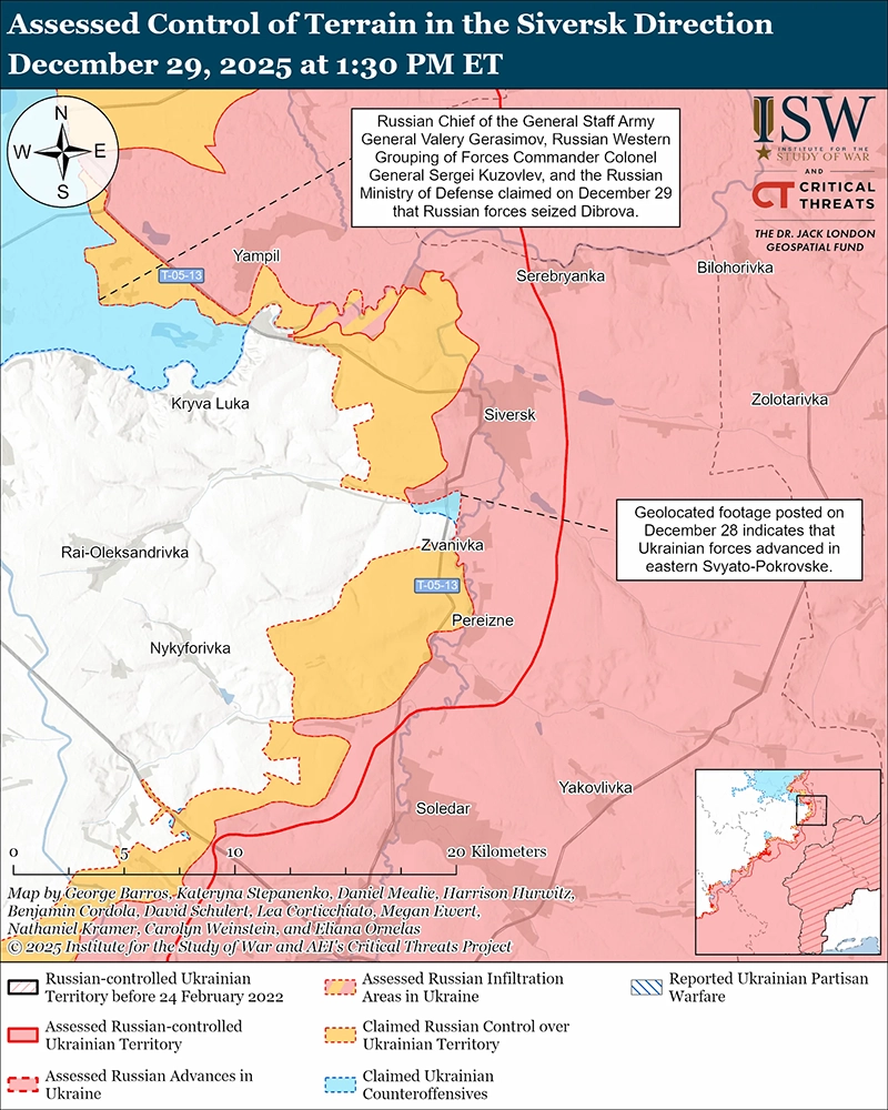 Путин и высокопоставленные российские военные продолжали активно расширять российские операции возле Купянска, несмотря на все имеющиеся доказательства того, что украинские войска освободили большую часть города и прилегающих территорий. [17] Командующий Западной группировкой войск России генерал-полковник Сергей Кузовлев заявил, что российские войска завершат окружение украинских войск в Купянске в январе-феврале 2026 года, что невероятно медленно по сравнению с тем, как давно российские официальные лица заявляют о почти завершенном захвата Купянска. [18] Герасимов особенно утверждал, что российские войска окружили украинские войска в Купянске по состоянию на 26 октября и захватили Купянск по состоянию на 20 ноября. [19] Российский военный блогер, освещавший Западную группировку войск, заявил 21 декабря, что российское военное командование установило крайний срок захвата Куриловки и Песчаного (оба юго-восточнее Купянска) до 1 января 2026 года. [20]