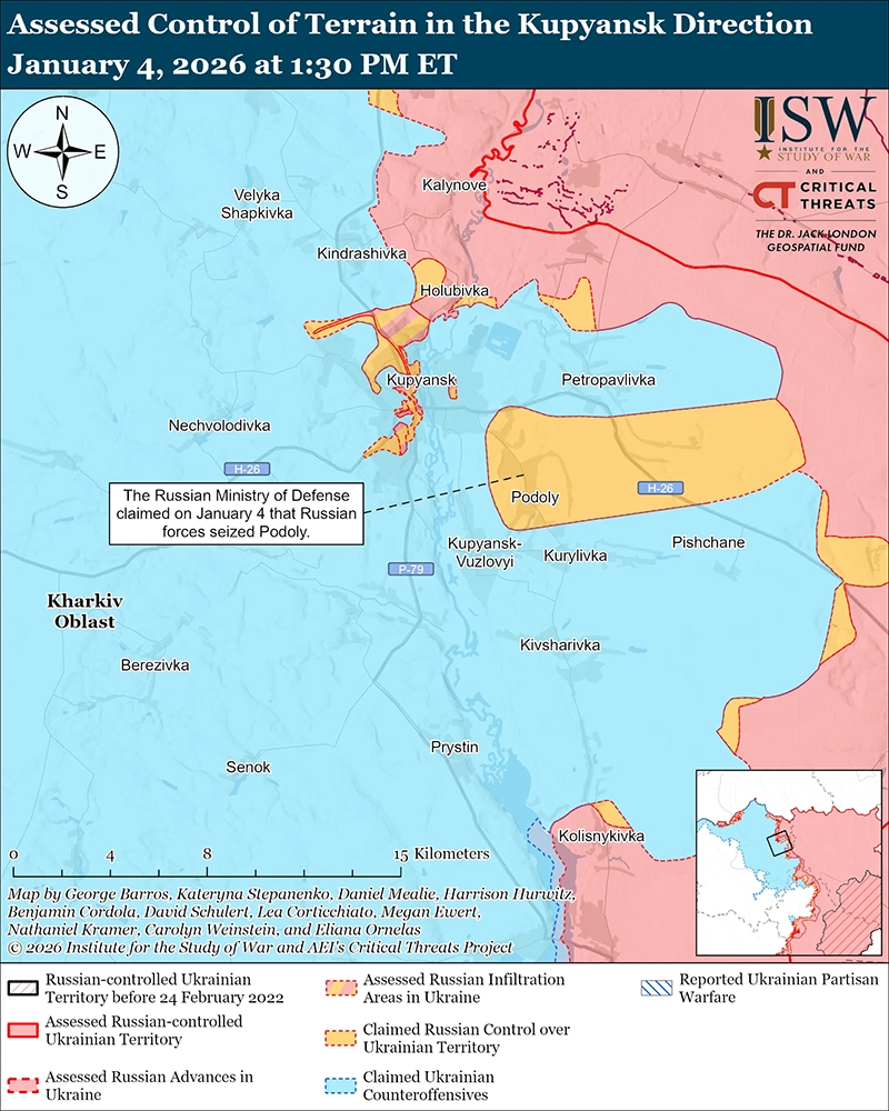 Оценённые продвижения украинцев: геолокационные кадры, опубликованные 28 декабря 2025 года и 4 января 2026 года, свидетельствуют о продвижении украинских войск в центральной части Родинского (к северу от Покровска) и незначительно в южном Гришино (к северо-западу от Покровска). [43] ISW оценивает, что украинские войска не продвинулись в южном Гришине за последние 24 часа.