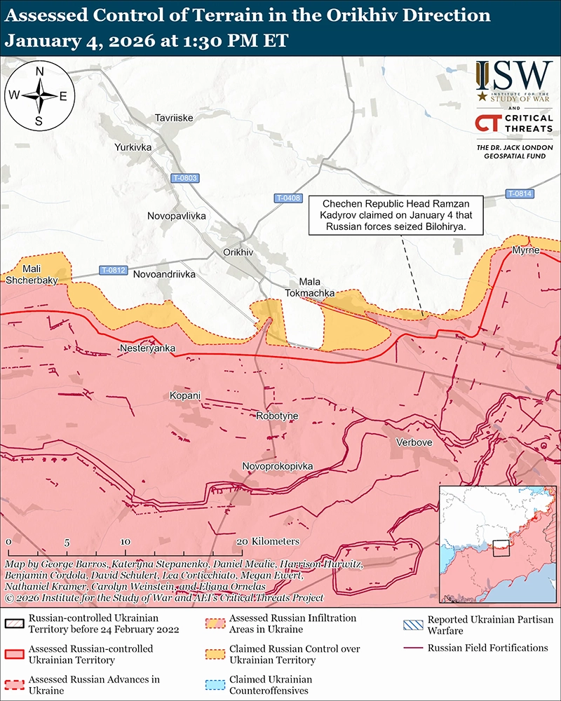 Российские войска атаковали юго-восточнее Орехова возле Белогорья и Малой Токмачки; к западу от Орехова, возле Степного и Щербаков; и северо-западнее Орехова в сторону Новоандреевки, Павловки и Новояковлевки 3 и 4 января. [58]