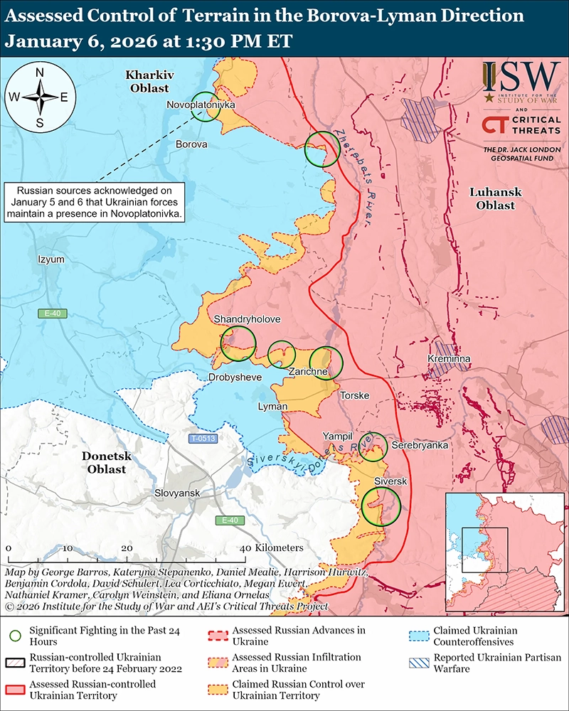 Российские войска атаковали возле самого Лимана; к северо-западу от Лимана возле Дробышева и в сторону Соснового; к северу от Лимана, возле Ставки; северо-восточнее Лимана возле Мирное; и к востоку от Лимана, возле Заречное, 5 и 6 января. [34]