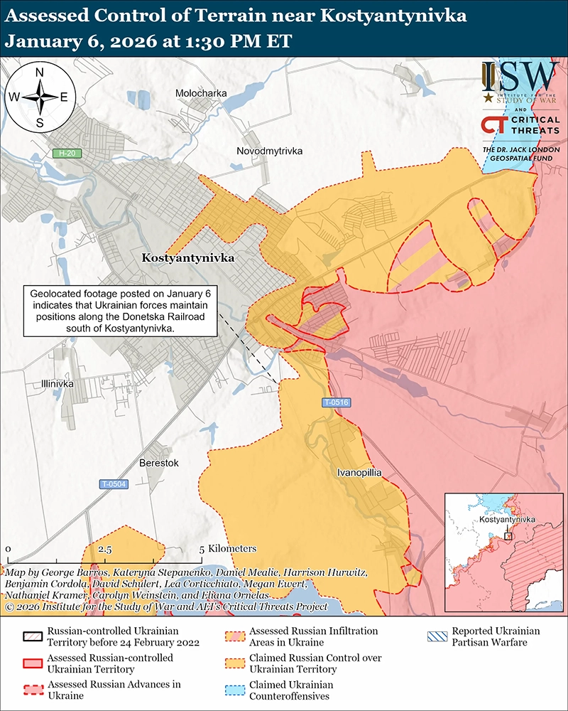 Уточнение территории под российским контролем: геолокационные кадры, опубликованные 6 января, показывают, как российские войска наносят удары по украинской позиции на улице Учебная в южной части Константиновки — районе, где российские источники ранее утверждали, что российские войска удерживают позиции. [42]