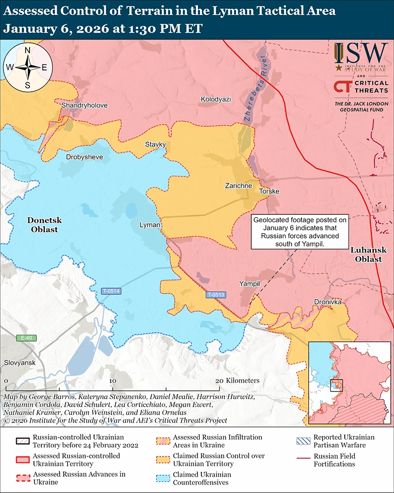 Оценка продвижения России: геолокационные кадры, опубликованные 6 января, свидетельствуют о том, что российские войска недавно незначительно продвинулись южнее Ямполя (к северо-западу от Северска). [37]