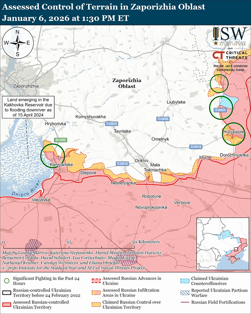 Российские войска продолжили наступательные операции в западной части Запорожской области 6 января, но не продвинулись.