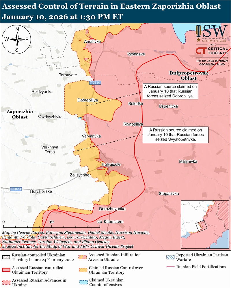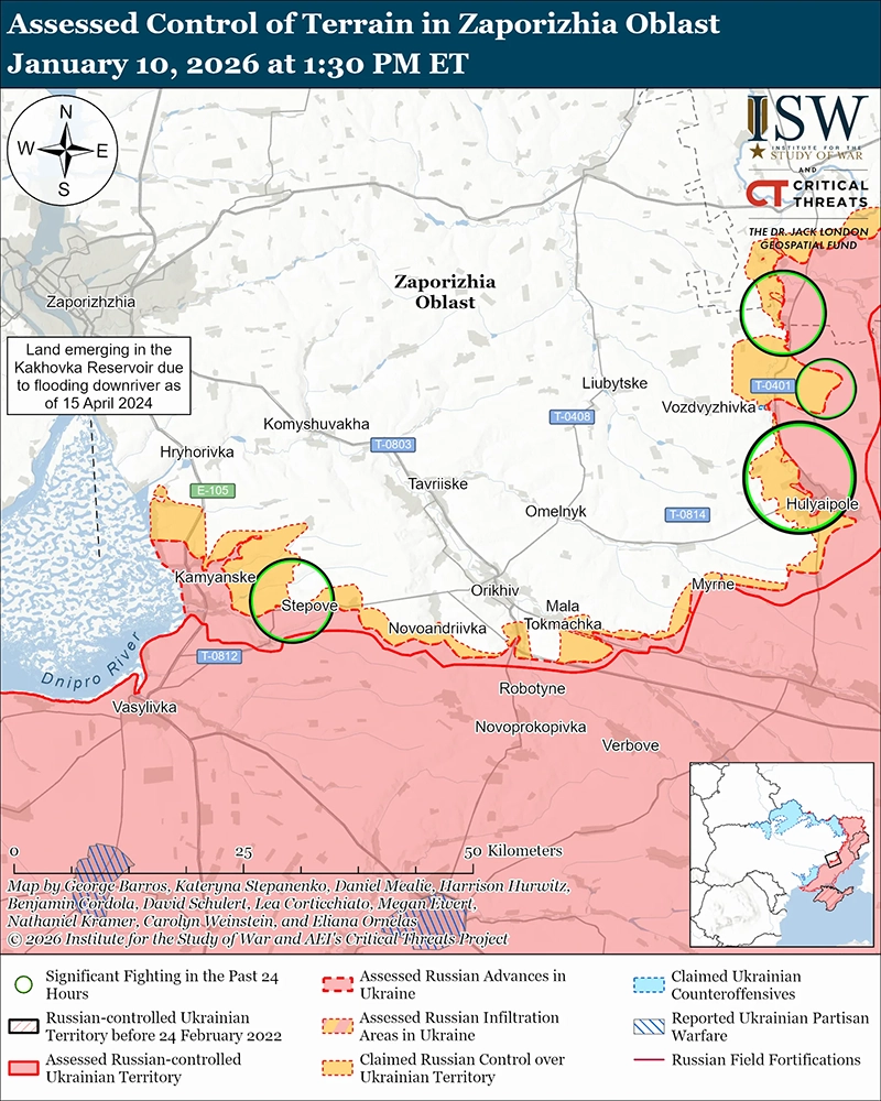 Российские войска продолжили наступательные операции на западе Запорожской области 10 января, но не продвинулись.