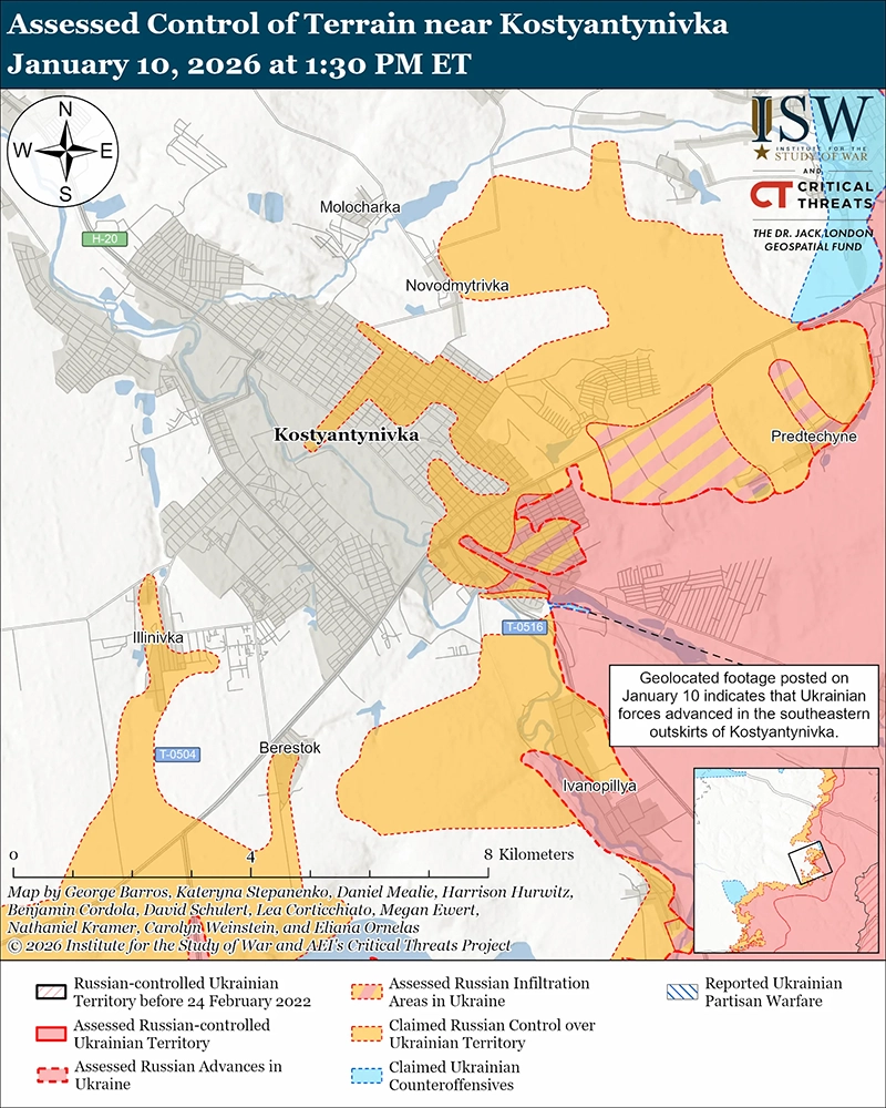 Представитель украинской бригады, действующей на направлении Краматорска, сообщил 10 января, что российские войска усиливают интенсивность своих атак в условиях ухудшения погодных условий, которые мешают операциям украинских беспилотников и в основном атакуют группами до пяти военнослужащих в сумерках и ночью. [56] Представитель заявил, что российские войска хорошо маскируют свои артиллерийские орудия, что затрудняет украинским силам определение типа артиллерии, которую они поражали во время контрбатарейного огня. [57] Российский военблогер, связанный с Кремлём, заявил, что российские войска лишь недавно захватили Майское (к северо-востоку от Константиновки), несмотря на заявления Министерства обороны России о захвате поселения в конце сентября 2025 года. [58] Российские военные блогеры утверждали, что существуют ложные сообщения о предполагаемом захвате Россией нескольких других неопределённых поселений в направлении Константиновки. [59]