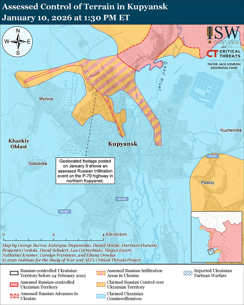Оценка российского проникновения: геолокационные кадры, опубликованные 9 января, показывают, как украинские войска наносят удар по российскому военному, действующему вдоль шоссе-79 Купянск-Чугуев на севере Купянска в рамках миссии, которую ISW оценивает как российскую инфильтрационную миссию, которая на данный момент не изменила контроль над местностью или передовой границей боевых действий (FEBA). [30]