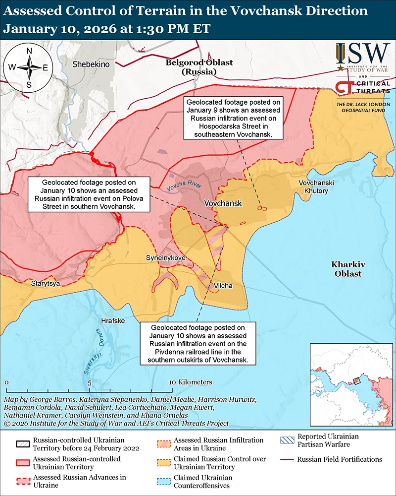 Оценка российского проникновения: геолокационные кадры, опубликованные 9 и 10 января, показывают, как украинские войска наносят удары по зданиям, оккупированным Россией, на юге и юго-востоке Волчанска (северо-восточнее Харькова) в рамках миссий по проникновению России, которые, по оценке ISW, не изменили контроль над местностью или передовой границей боевых действий (FEBA) в данный момент. [27]
