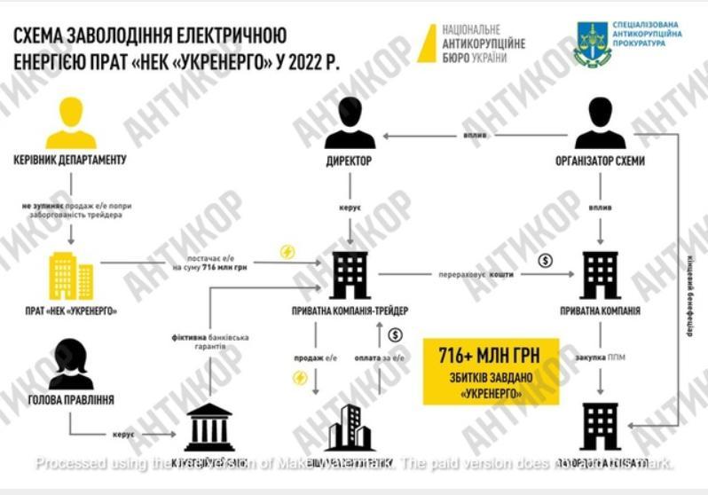 По-перше, варто згадати справу щодо завдання збитків у розмірі 716 мільйонів гривень ПрАТ «НЕК «Укренерго». Слідство встановило, що в березні 2022 року ТОВ «Юнайтед Енерджі» закупило в «Укренерго» електричну енергію на суму понад 716 мільйонів. Попри те, що приватна компанія прострочувала оплату, електроенергія продовжувала їй надаватись. Гарантом оплати виступав банк «Альянс».