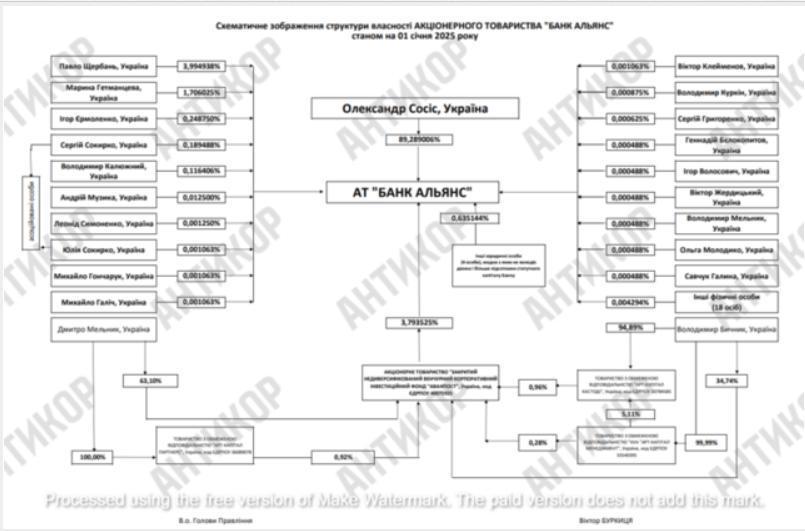 У листопаді 2025 року Державна аудиторська служба повідомила, що всього «Юнайтед Енерджі» заборгувала «Укренерго» 1,624 млрд грн. І хоча існувала банківська гарантія від банку «Альянс», державний оператор її не реалізував, а фінансова установа погодилась з вимогою тільки на 133 мільйони гривень.За даними реєстрів, власником банку «Альянс» є Олександр Сосіс. Водночас серед міноритарних акціонерів станом на 1 січня 2025 року можна побачити такого собі Павла Щербаня. За даними ЗМІ, він є кумом колишнього заступника голови Офісу президента Ростислава Шурми, і саме його вважають одним із кураторів діяльності банку.