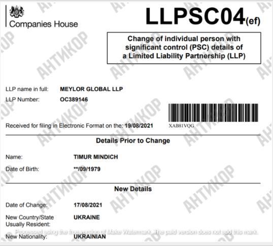 Народний депутат Ярослав Железняк стверджує, що Якоб Хартмут має компанію в Лондоні Harvest investment solutions limited з тією ж адресою, як і фірма Тимура Міндіча Meylor global LLP. За даними лондонського реєстру, Міндіч дійсно був особою, що контролювала компанію, принаймні у 2021 році.