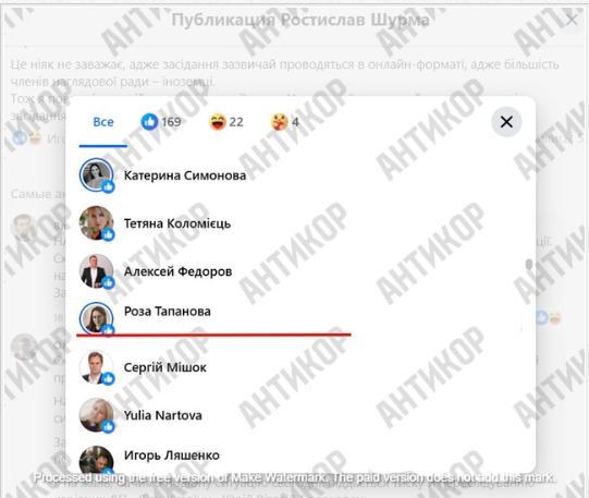 Цей пост Ростислава Шурми у Facebook вподобала давня бізнес-партнерка ексголови ОП Андрія Єрмака – Роза Тапанова. Та сама, яку при Єрмаку «засунули» в наглядову раду «Укрнафти», наглядову раду «Ощадбанку» і зробили директоркою Національного історико-меморіального заповідника «Бабин Яр».