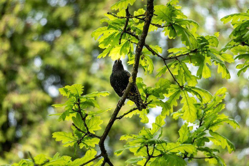 Европейский скворец, сидящий на ветке дуба в весеннем лесу среди ярко-зеленых листьев и при естественном освещении – фотография природы и дикой природы.