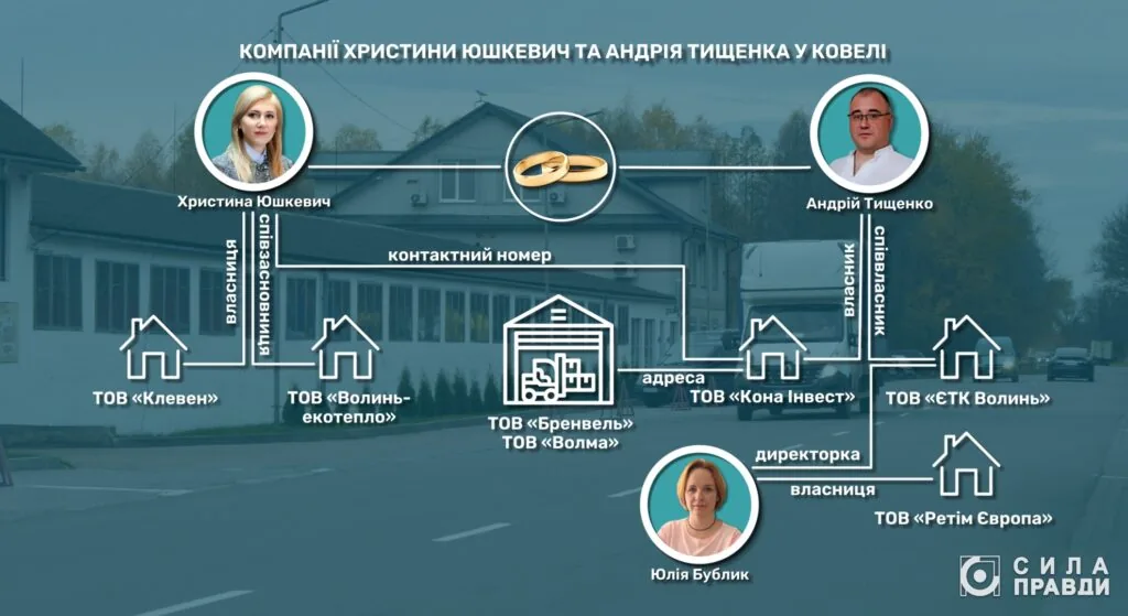У 2019 році Христина Юшкевич стала власницею фірми «Клевен» у Ковелі на вулиці Драгоманова. Андрій Тищенко у тому ж році став співвласником компанії «ЄТК Волинь», яка зареєстрована на тій самій вулиці. Нагадаємо, що цю компанію свого часу очолювала вже згадана Юлія Бублик – власниця естонської компанії «Ретім Європа».
